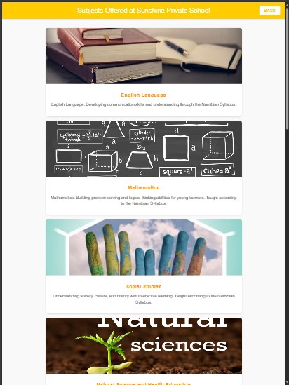 The following subjects are offered at Sunshine Private School: All subjects are taught according to the Namibian Syllabus.
